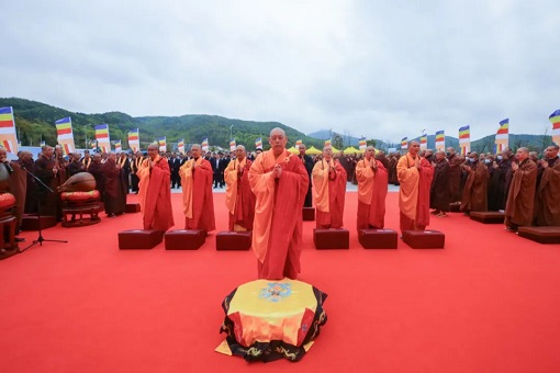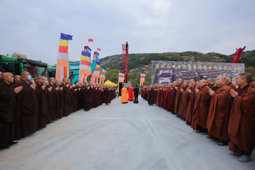 會長道慈大和尚首先主持觀音法界普隱精舍上土地供儀式,隨后與普陀山佛教協會各副會長一道為開工活動現場灑凈祈福。灑凈后,道慈大和尚主持了上佛供儀式。最后,由王高瞻部長宣布普陀山觀音法界普隱精舍工程建設正式開工。