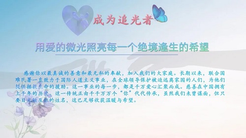 愛,無論膚色,無論國界,在國際婦女慶典活動最后,公司號召所有建經(jīng)人成為追光者用愛的微光照亮每一個絕境逢生的希望,倡議大家積極參與由聯(lián)合國難民署、中國紅十字基金會發(fā)起的國際難民募捐活動