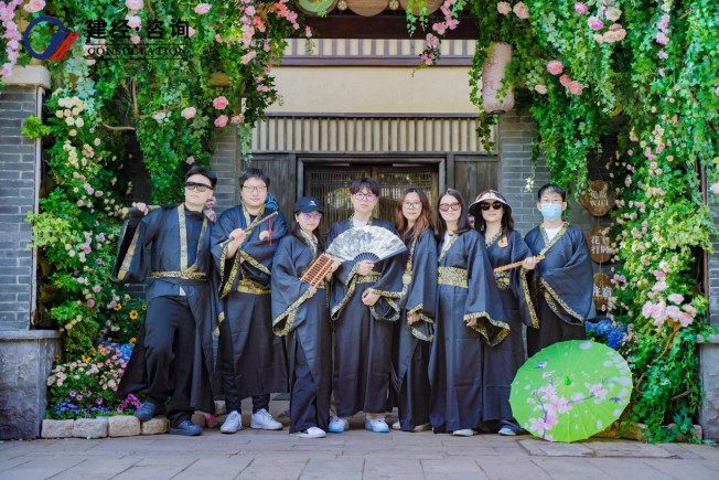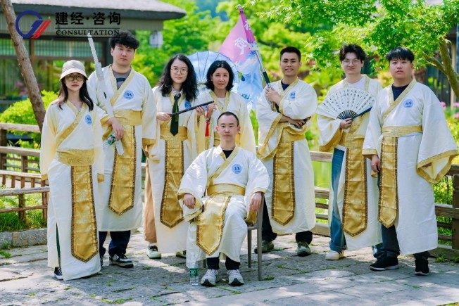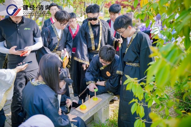 拈花灣的禪意山水,倏然化作明清商埠的繁華江湖。八支小隊化身“浙商八大家族”,身著綢緞長衫,腰懸鎏金算盤與竹笛利劍,在團建教練的號令下,共啟一場跨越時空的商戰風云。